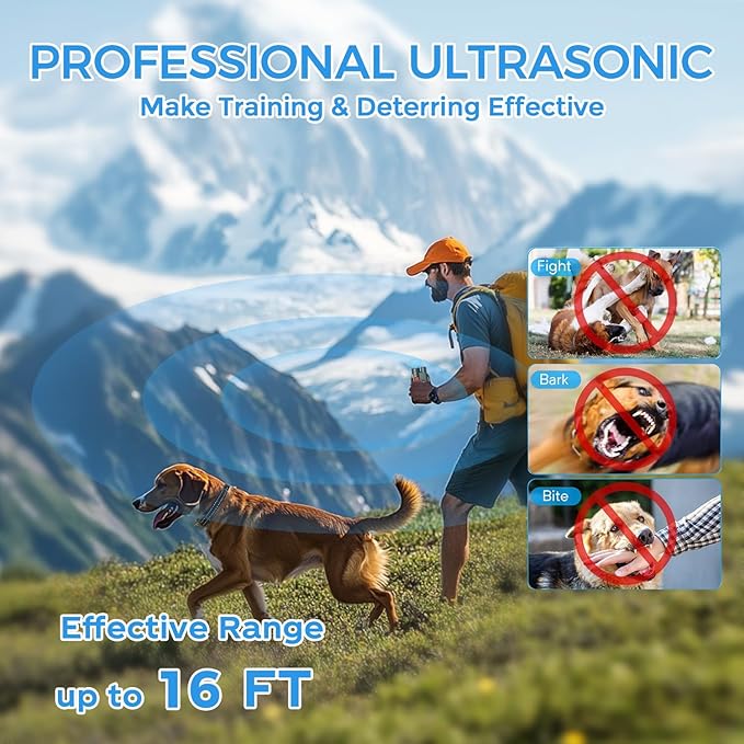- [Up to 3300 ft Control Range – Perfect for Outdoor Adventures] Enjoy full control even in vast outdoor spaces, with a remote range of up to 3300 feet. Whether you're hiking, playing fetch in the park, or letting your dog run free at the beach, this collar ensures you can manage your dog from a distance. Note: The ultrasonic mode works best up to 16 feet—ideal for indoor training or short-range correction in the backyard. It also supports dual-dog control, so you can train two dogs at once.