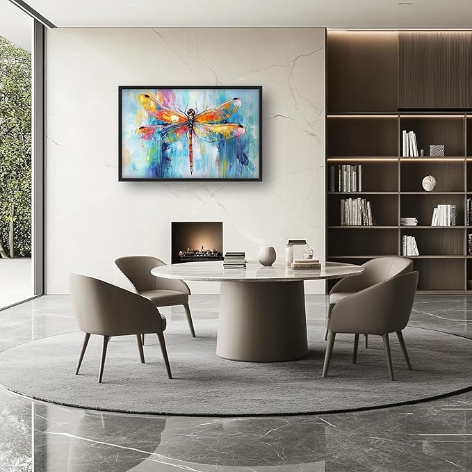 - 【Unique Design】 Colorful dragonfly painting, with vibrant colors and a colorful background, created using oil paint and detailed brush strokes. The large wings of the dragonfly are spread out, showcasing the bright colors.