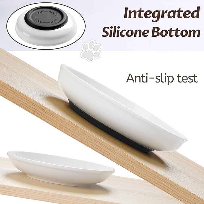 - 【No Slide, No Clank Noise】: To prevent slidding, we designed a integrated silicone base, ensures that the food bowl will not tip over or move easily during feeding time. Besides, the silicone base can protect your floors, and reduces the noise from clanking.