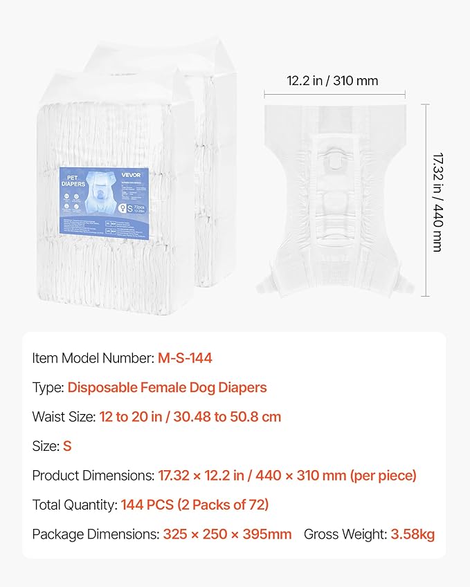 - Super Absorbent: VEVOR XS-sized disposable female dog diapers feature a super absorbent core that quickly locks in liquid, offering 360° leak-proof protection with no backflow. Perfect for dogs in heat cycles, pet training, incontinence, post-surgery recovery, and travel. Suitable Waist Size: 9-16 inches / 22.86 - 40.64 cm