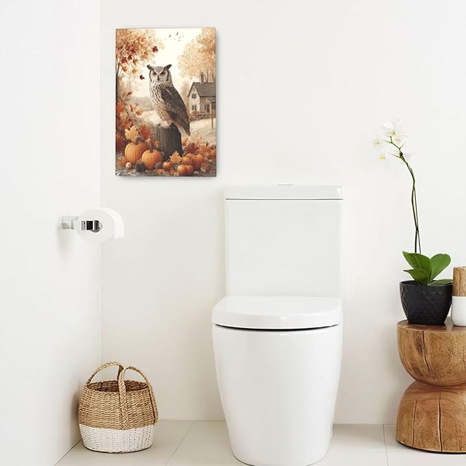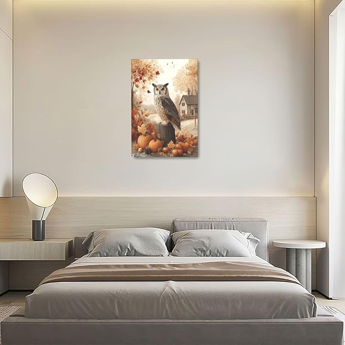 Fall Owl Wall Art Autumn Pumpkin Leaves Wall Decor Rustic Canvas Print Farmhouse Pictures Painting Print Framed Artwork Decorations Gifts for Living Room Bathroom Bedroom Office 16"x24"