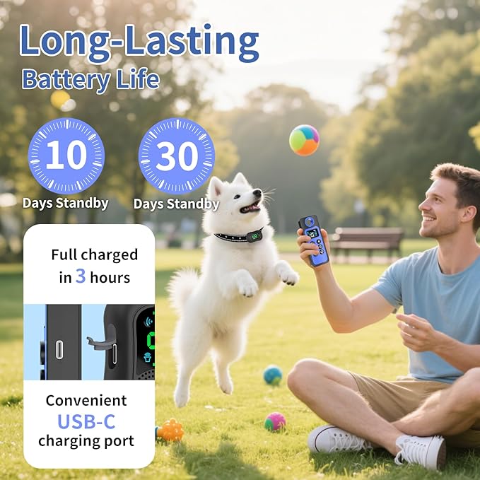 - 【Incredible Battery Life & Quick Charging】 Charging via USB, 2-in-1 fast charging only 2 hours to be fully charged. This dog training collar with remote provides battery life that lasts for a long time, the e collar can last up to 10 days of standby time and the remote 30 days!