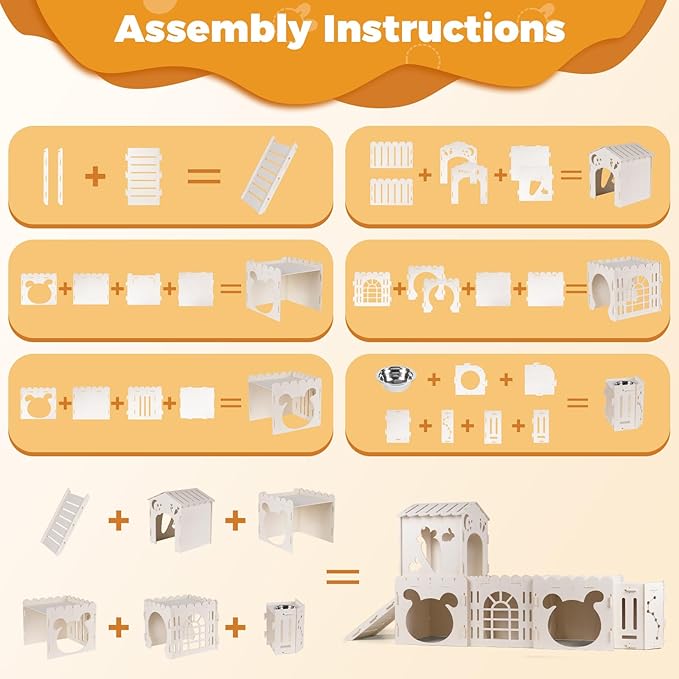 - 【3-in-1 Upgraded Rabbit House】Includes 4 interconnected bunny castles, 1 slide, 1 feeder, and 1 stainless steel bowl, offering rabbits a cozy space to rest, play, and dine—all in one fun habitat.