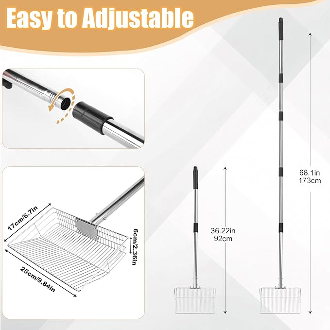 Chicken Poop Scooper with Stainless Steel Handle,24" to 68" Adjustable Length Chicken Coop Litter Scoop,4 in 1 Multifunctional Heavy Duty Litter Sifting Shovel Chicken Coop Accessories