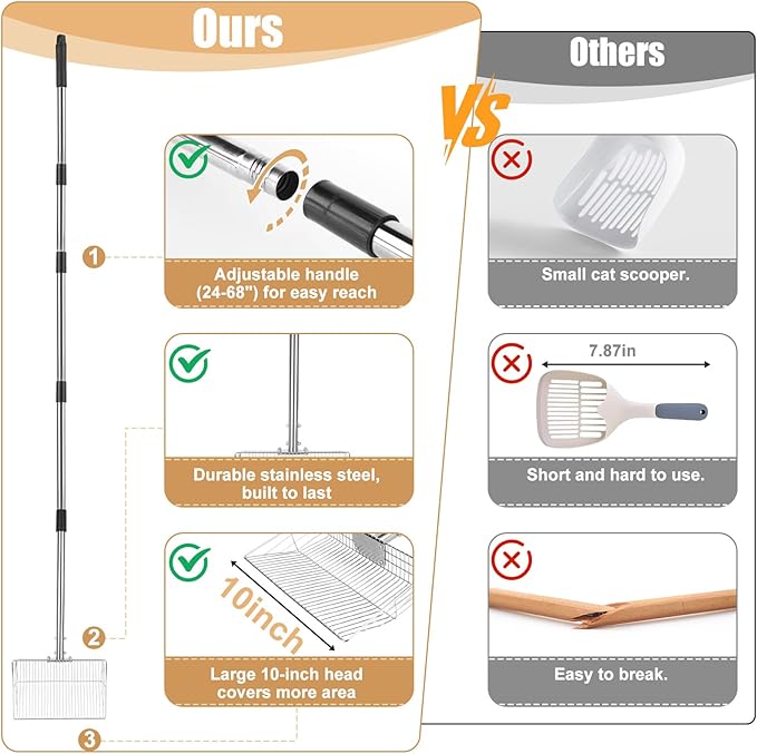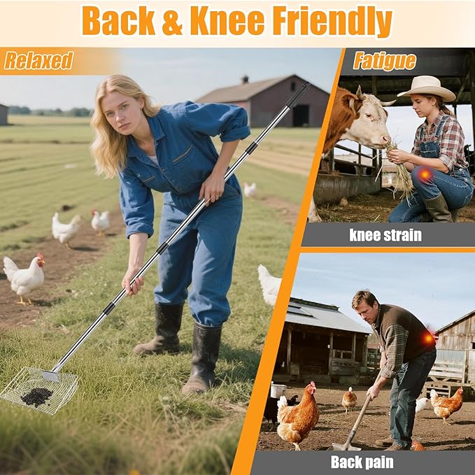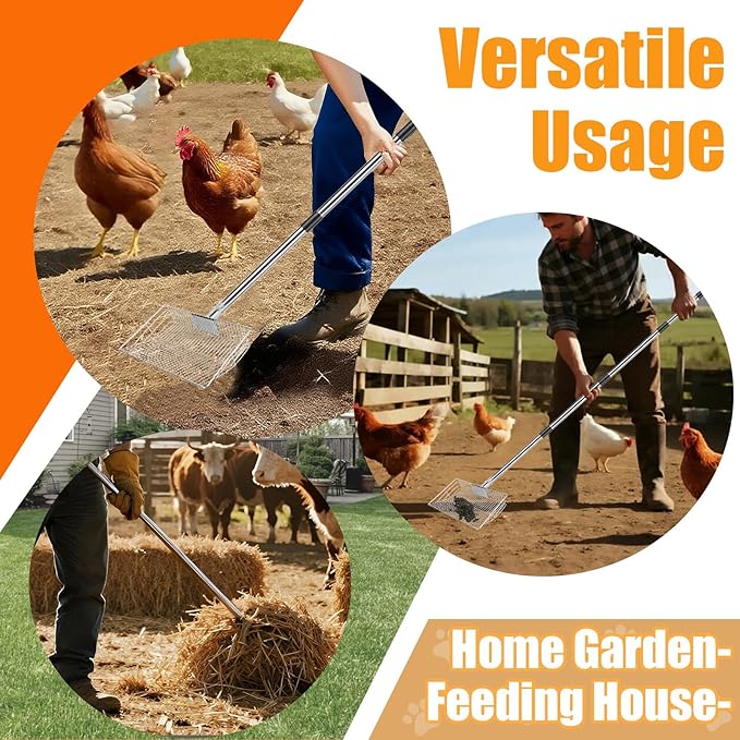 - 【Ergonomic Long Handle Design】Back pain from bending over too much? The extended handle design minimizes bending and strain, making coop cleaning less tiring. Comfortable to grip and stable to use, it doubles as a long handled litter scoop, chicken rake and scoop, or chicken coop rake—perfect for larger coops and chicken runs without hurting your back.