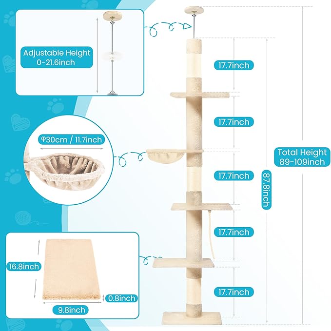 - Dimension: The main body of the cat tree is 87.8in high, and can be adapted to the ceiling of 89-109 in through splicing and adjustable screw rods. By utilizing the vertical space from floor to ceiling, this cat tree design optimizes space utilization. It's a great solution for cat owners who want to provide their cats with vertical enrichment while minimizing clutter.