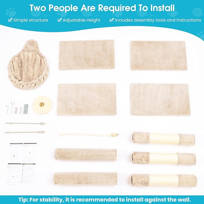 - Sturdiness and Stability: When installing, press down the main body of the cat tree as hard as you can, then rotate the rod up to the maximum length to withstand the ceiling and lock it until the cat tree no longer shakes.