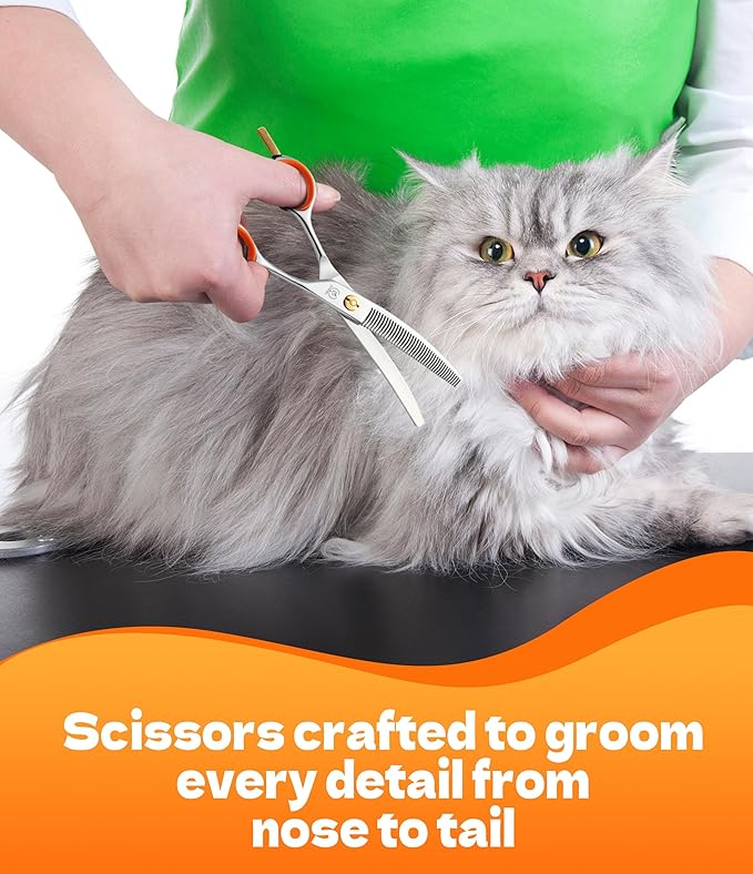- sharp and Fine Cut - These dog & cat grooming scissors are sharpened by handicraftsmen. Experts check the scissors' sharpening one by one. Consequently, the blades of these pet grooming scissors are extremely sharp, and the cut is very fine, precise, and fast, It works very well on any type of coat, regardless of whether it is thick, wiry, or curly.