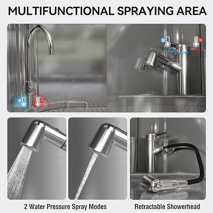 - Spacious Bathing Zone & Rapid Drainage - Dog grooming tub provides a 48-inch oversized space with dual drainage channels, swiftly clearing water even under high pressure. A reachable storage platform (with drainage gaps) and dry-wet drawers organize tools, while the 360° dual-mode faucet simplifies deep cleaning or quick rinses