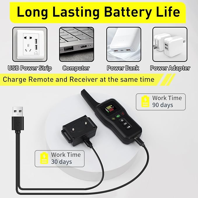 - 【 Waterproof and Battery 】 The automatic bark collar for 3 dogs has an IPX7 waterproof and long-life battery. The work time after a full charge is 90 days for remote control and 30 days for receivers.