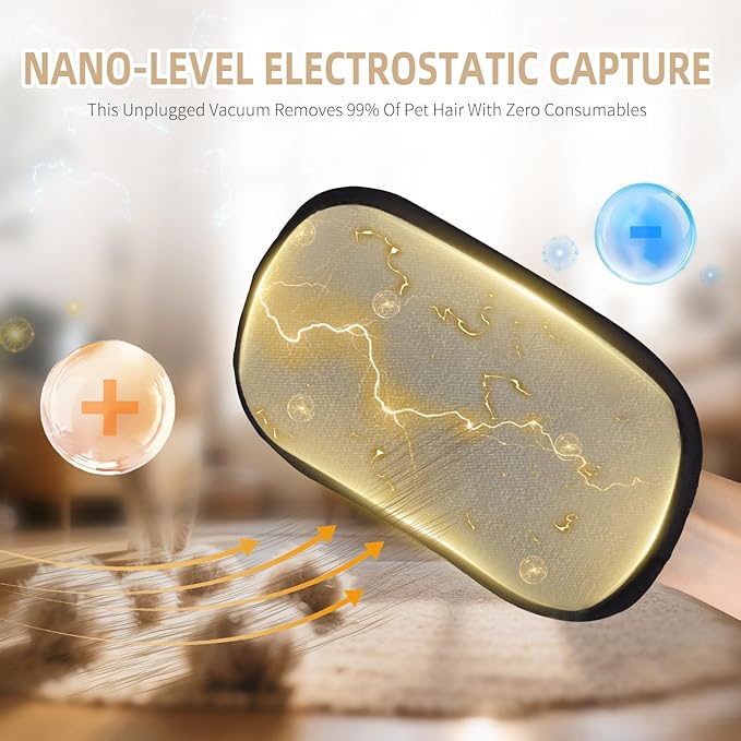 - โกใEffortless Cleaning with Electrostatic TechnologyใHarnessing the power of static electricity, our magic brush pet hair remover effortlessly lifts lint, pet hair, and dust with easy left-to-right strokes. Forget about tedious rolling or fighting stubborn debrisโour gloves make cleaning a breeze, transforming your experience into a simple and enjoyable task.